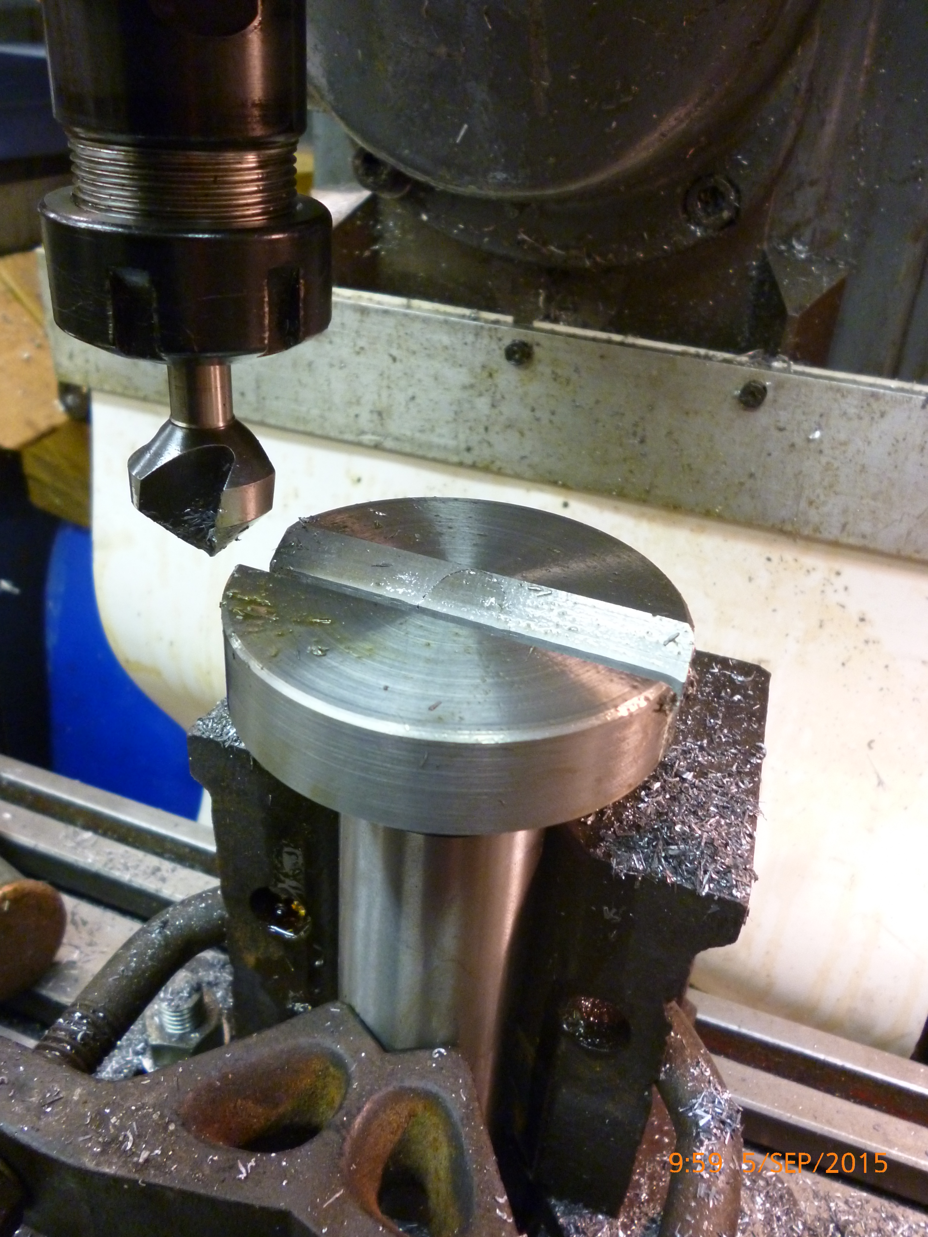 What is needed now is a V cut in the round part of the jig. On a vertical mill it is unusual to get a cutter that will do this directly.