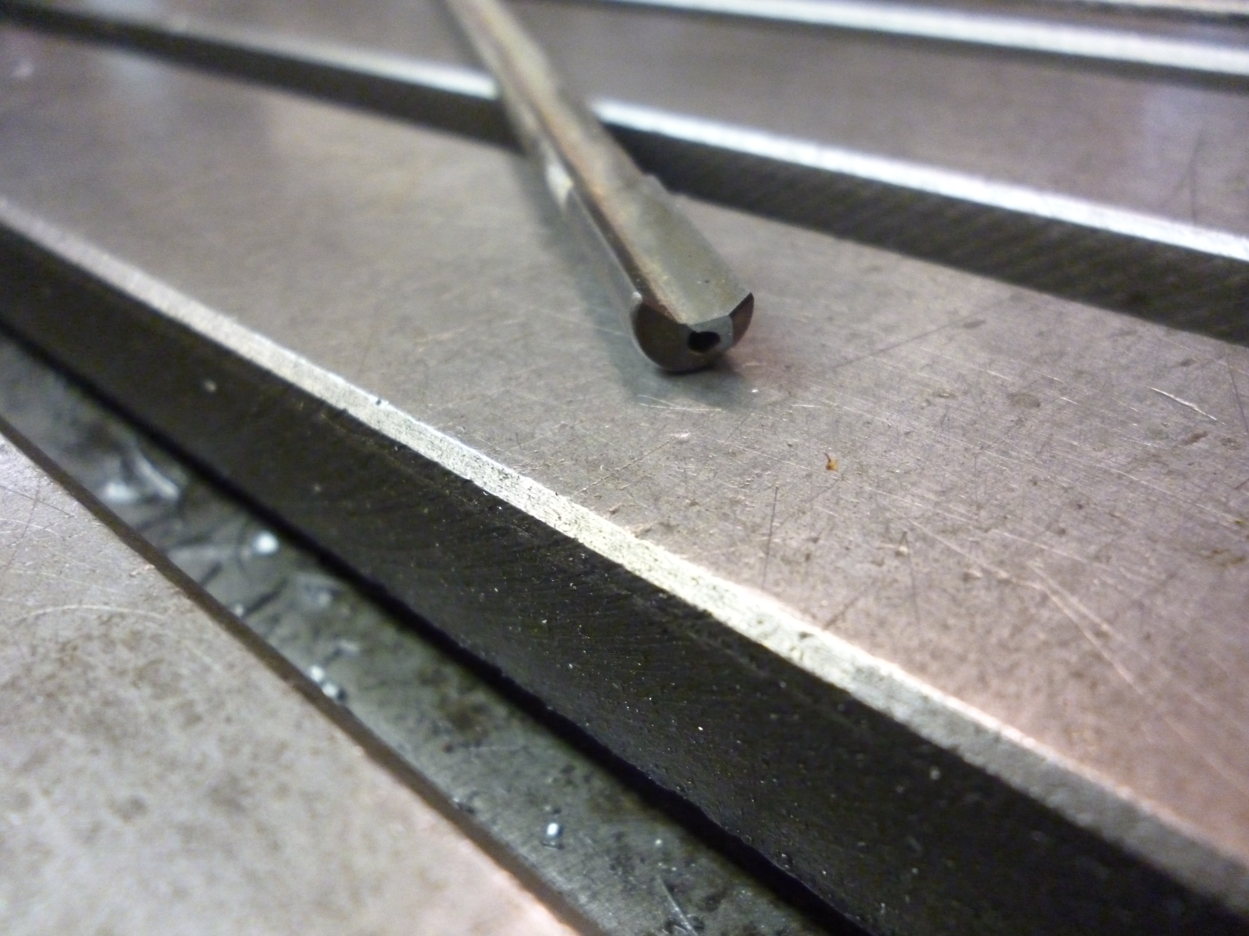 A gun drill is nothing like a traditional drill bit. There are certain key features. Firstly the shaft of the gun drill is made from a hollow tube. This tube is slightly smaller in diameter than the hole being drilled. This tube is squashed on one side to form a v-shape along the length of the tube. This is so coolant can be pumped down the middle of the tube. It comes out at the cutting edge and the returns in the V-shaped groove. The coolant is pumped in at a very high pressure so as to force the swarf back along the V-shape.