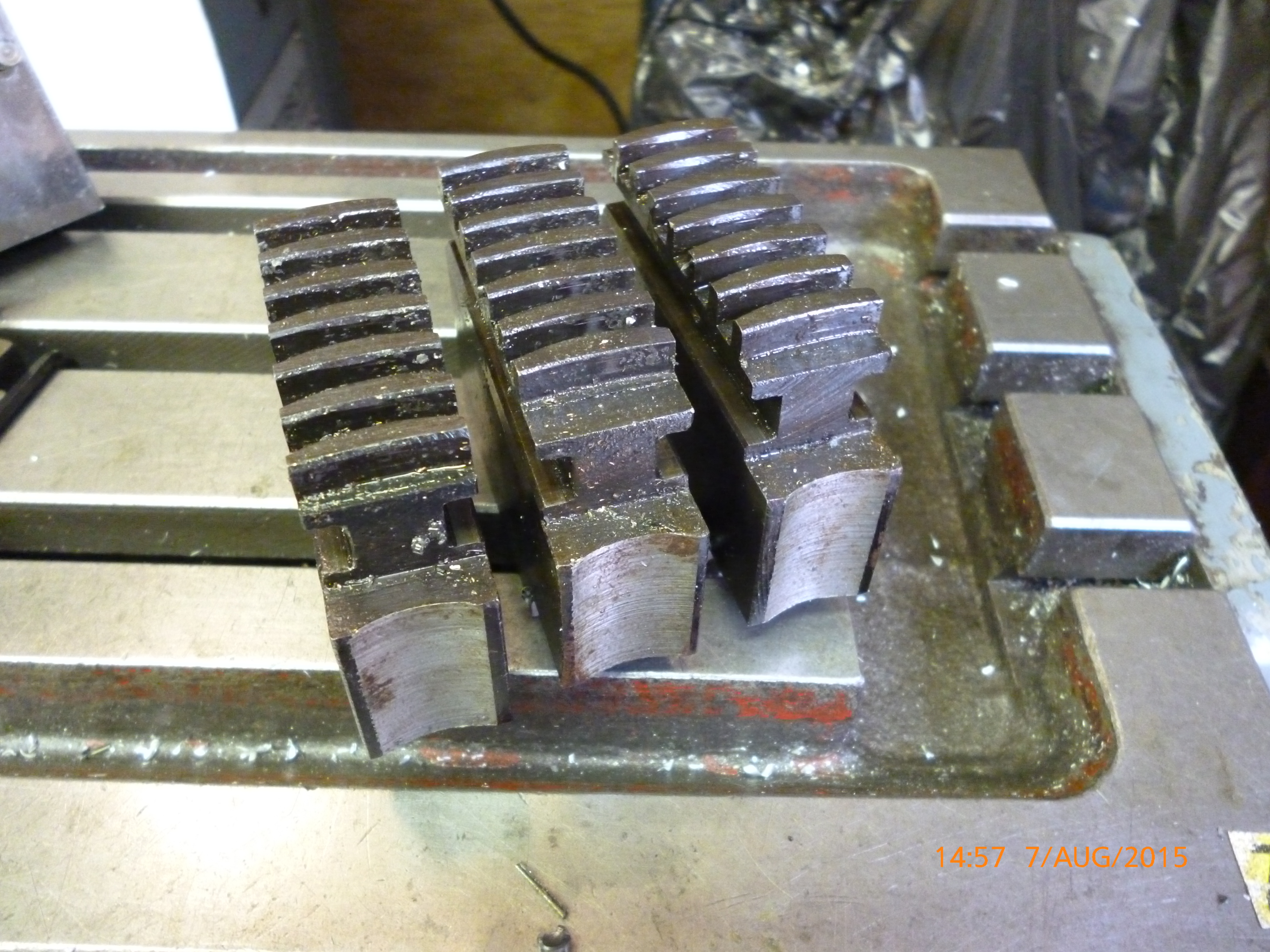 The jaws on a three jaw chuck are usually made of hardened steel. However, it is sometimes possible to get jaws that will fit the chuck but are made of “soft” steel. These jaws have teeth on them and the grooves that let them fit the t-slots on the chuck but the rest of the jaw is just a plain slab of steel.
