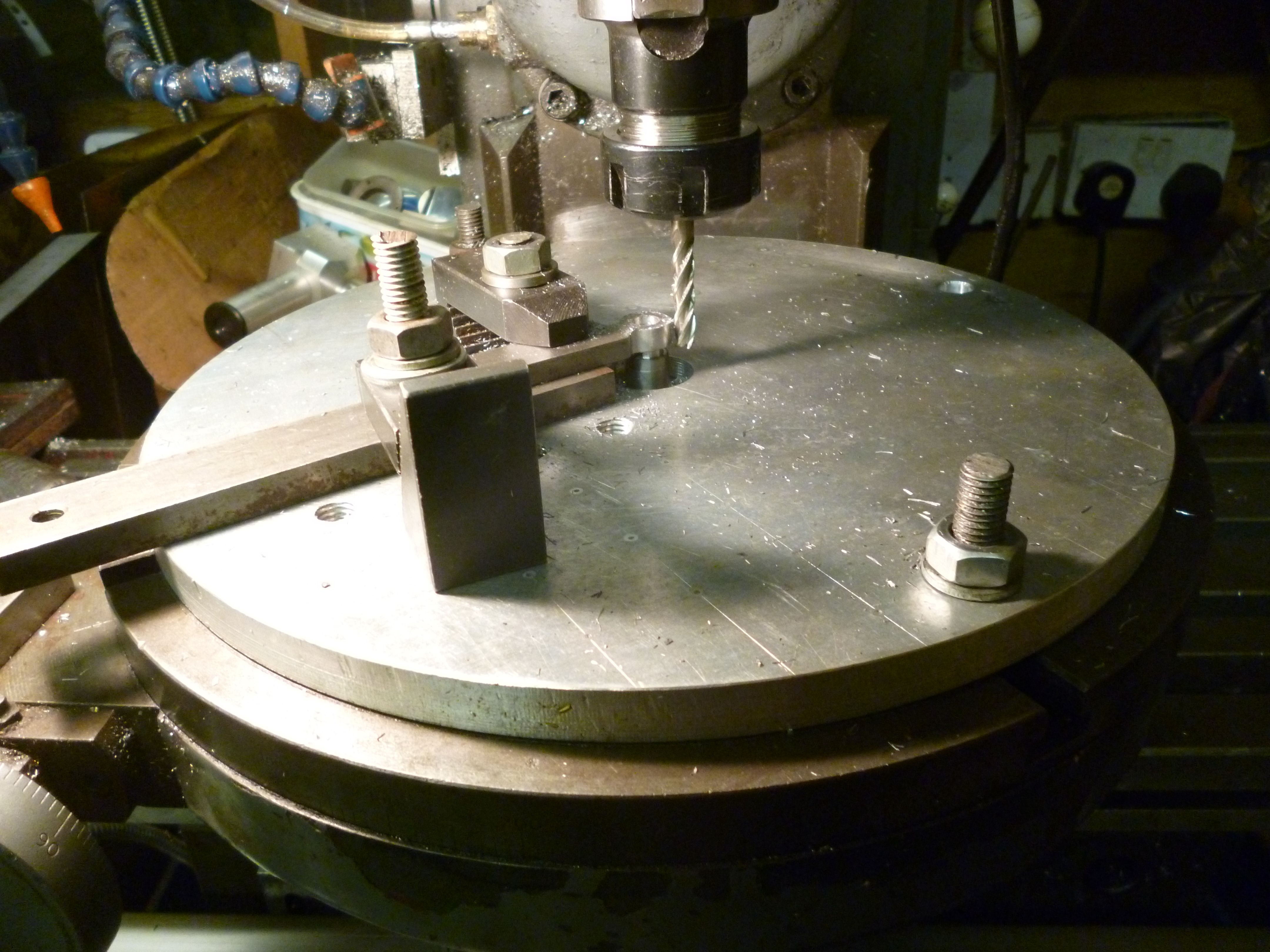 In this case a large round plate was made to fit a large rotary table. It has holes round its edge so it can be bolted onto the rotary table. It has a hole in the middle so there is good access to the hole in the rotary table. The fitting of this plate on the rotary table is not critical. When the plate is fitted all alignment is done using the hole in the rotary table.