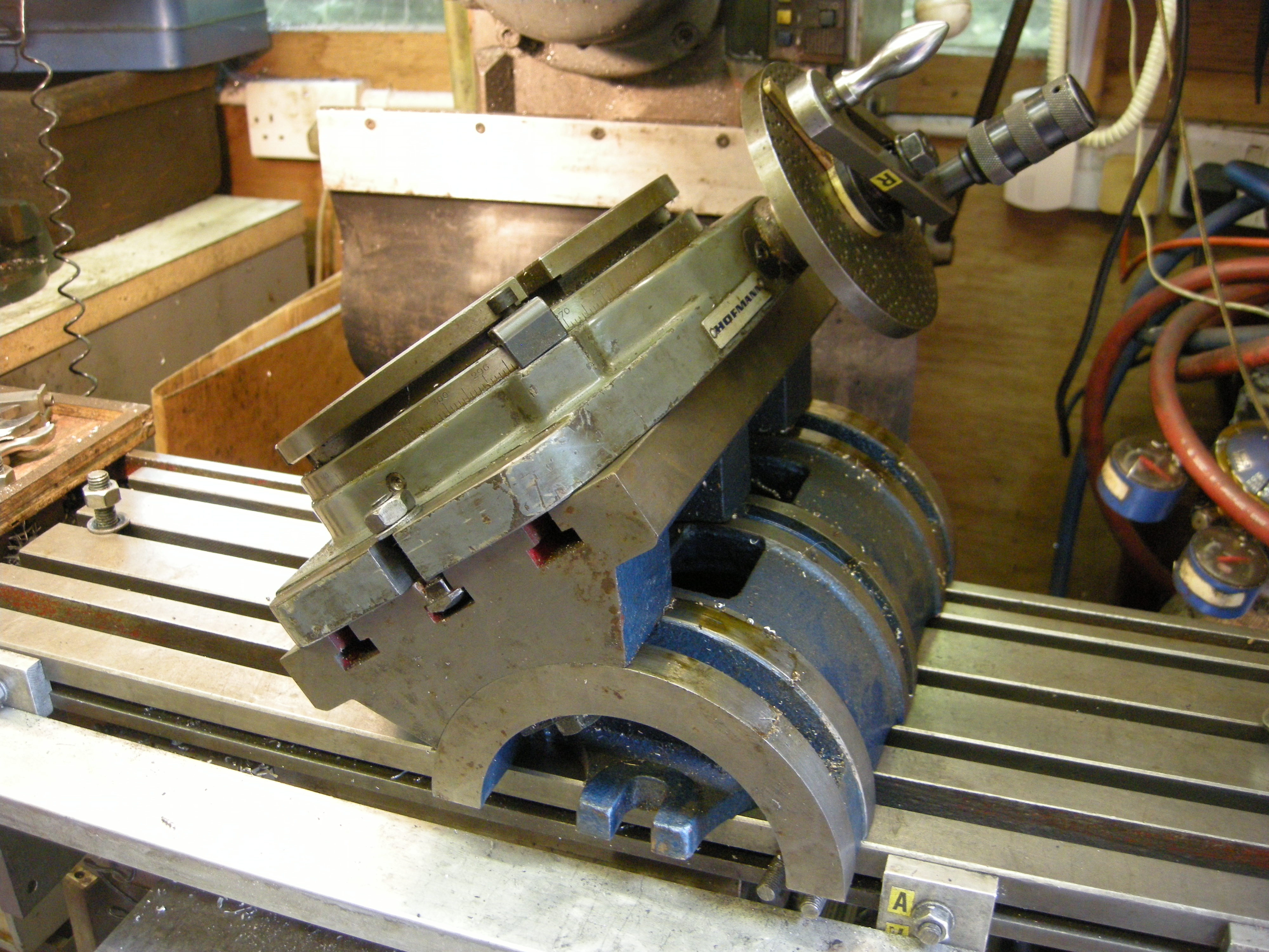 Usually the tilt required will be from left to right because there is not going to be enough depth on the milling table of a small milling machine. Some of the devices that could be used such as a tilting vice or tilting table will not fit the milling table sideways. This means the tilting vice will only fit if it also swivels. But with a tilting table a sub table might be needed.