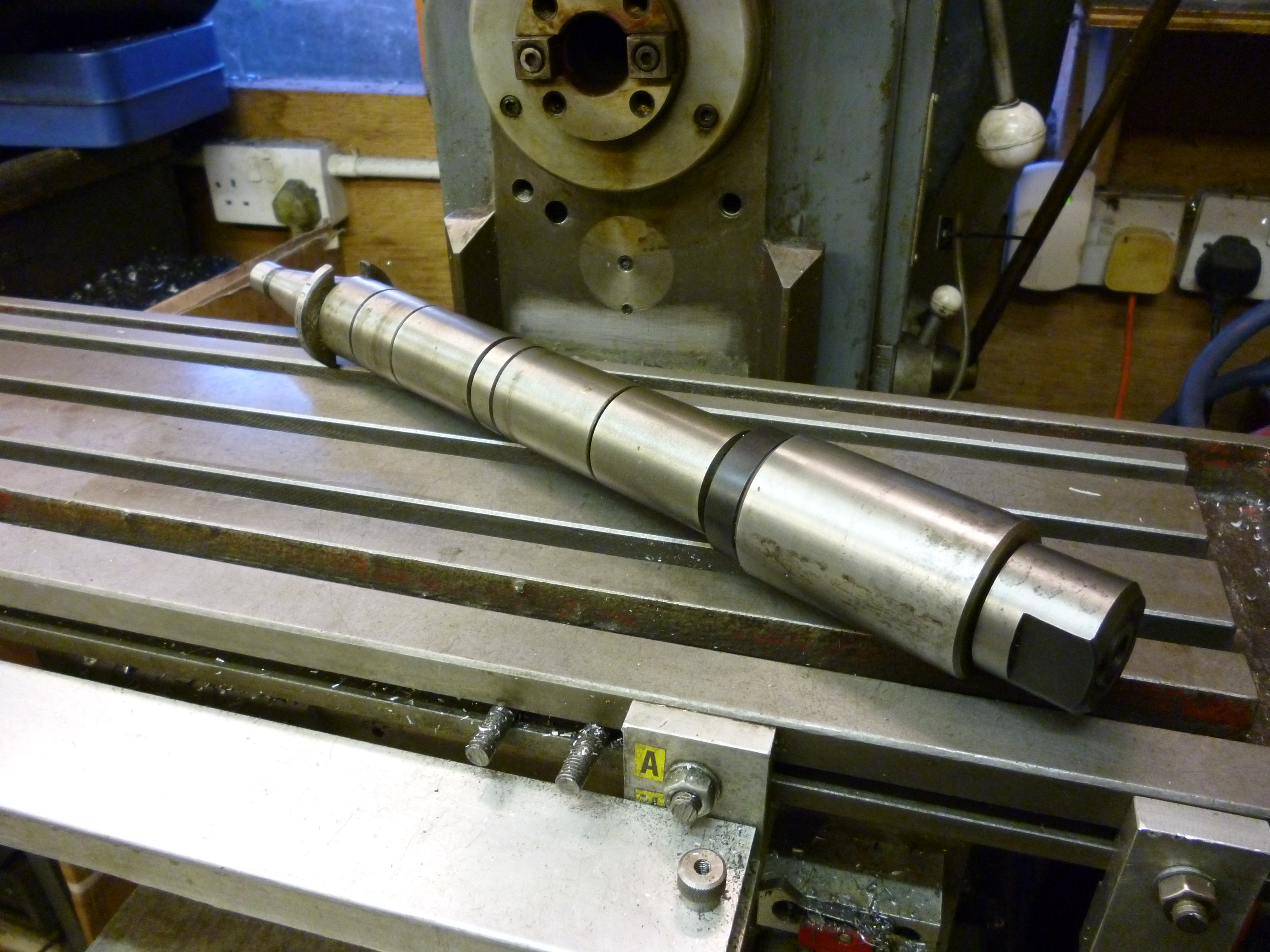 On the horizontal milling machine the usual tool holder is the horizontal arbor. This consists of a hardened and precision ground round bar. One end has a taper to fit the spindle of the machine. This would usually be the horizontal spindle.The other end has a special nut (i.e. it usually has a left-handed thread). The arbor has a keyway all along its length. It comes with some keys of varying length. The arbor has spacers that fit it. A new arbor comes with spacers that fit the whole length of the arbor. The spacers vary in length so the gap between the spacers can vary. Spacers can be juggled about so the cutter can be positioned at any required position on the arbor.