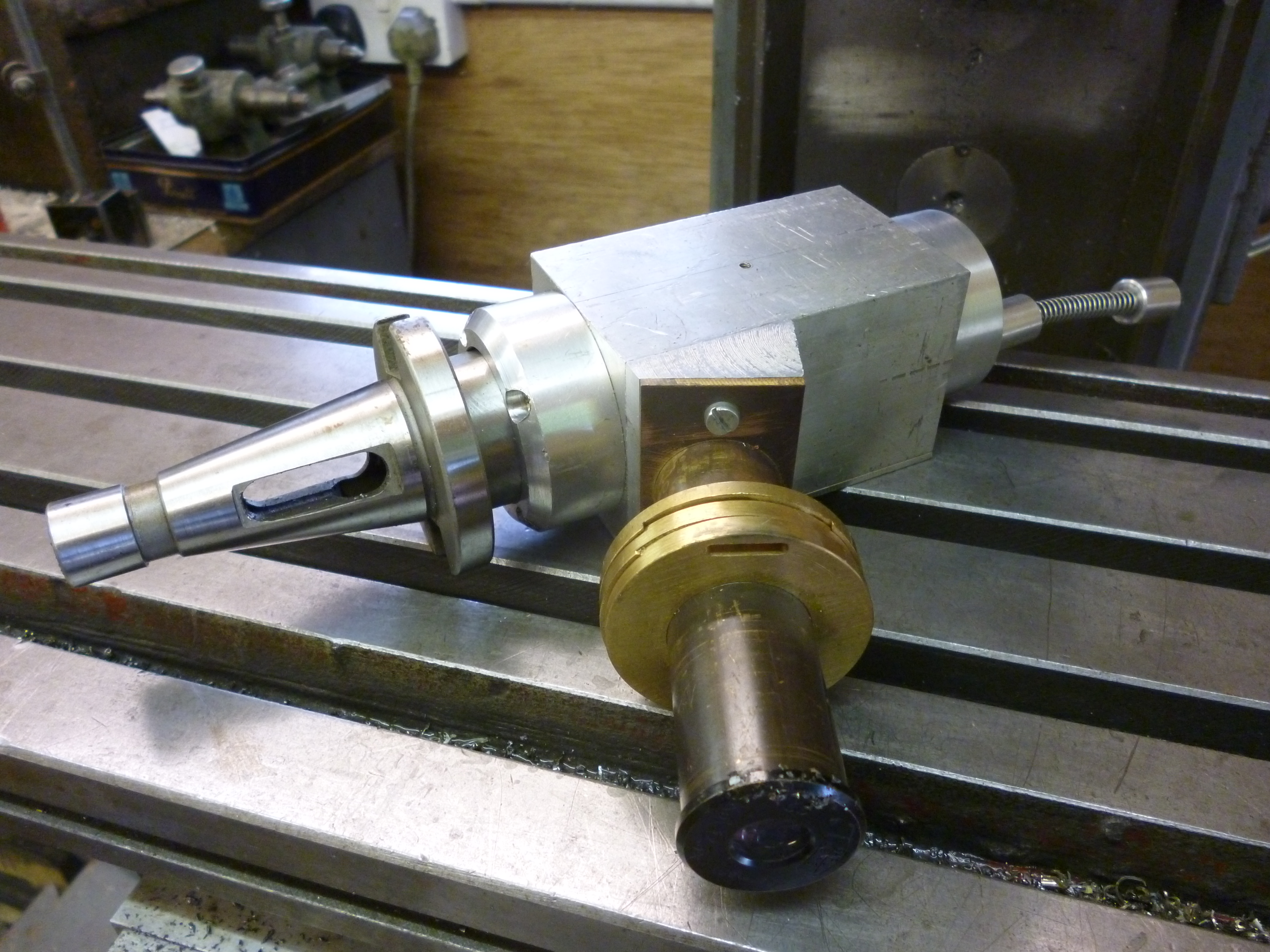 The centering microscope is primarily designed for use on a milling machine. The idea is that it fits in the socket of the spindle. The eyepiece branches off to where the user can look into it. It contains a graticule.